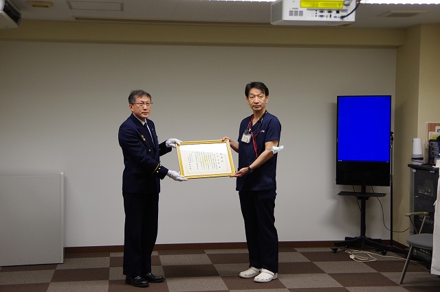 令和7年7月13日、古平町琴平神社例大祭火渡り会場で発生した心肺停止状態の傷病者に対して、祭りの会場に訪れていた医療法人菊郷会 愛育病院(札幌市)の副院長 町田卓郎氏の迅速で断続的かつ有効な胸骨圧迫(心臓マッサージ)を継続、救急隊に引継ぎにより病院へ搬送され、傷病者が一命をとりとめただけでなく、その後無事に社会復帰できたことは、今後の一般住民が行う救命活動の重要性を知ってもらう上でも賞賛に値する活動であり令和7年12月4日同病院において感謝状の贈呈を行いました。